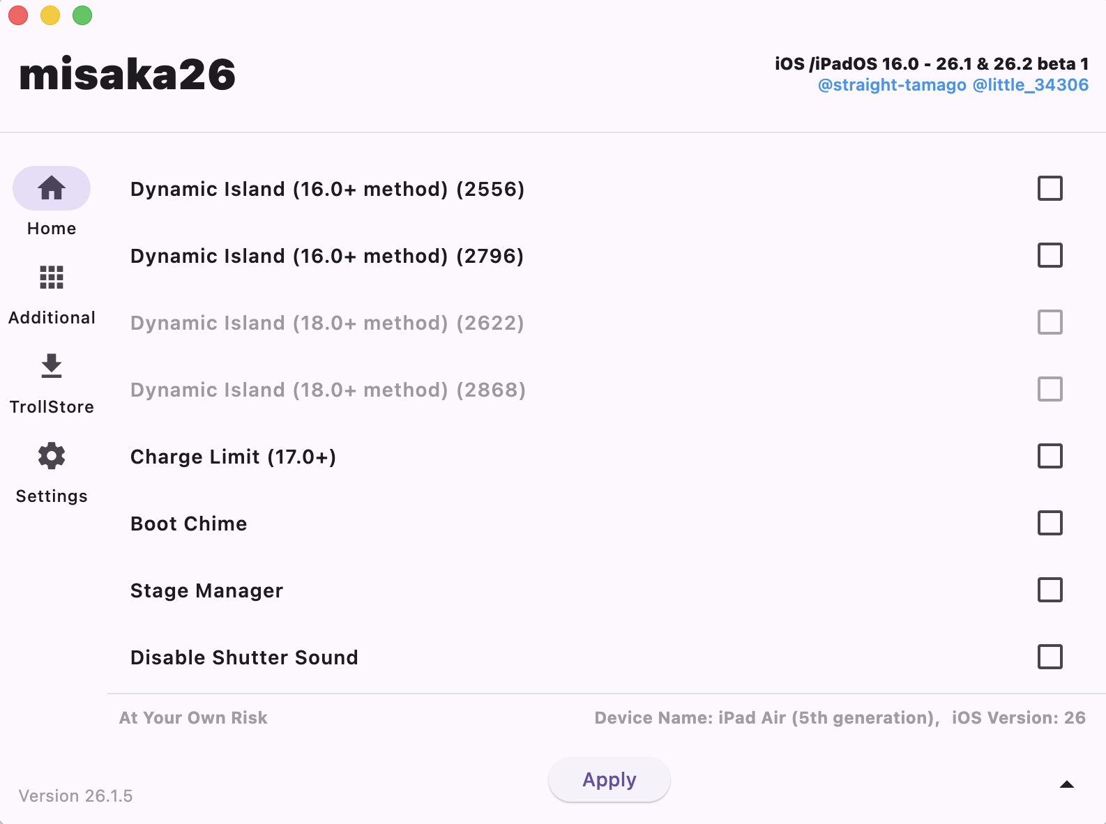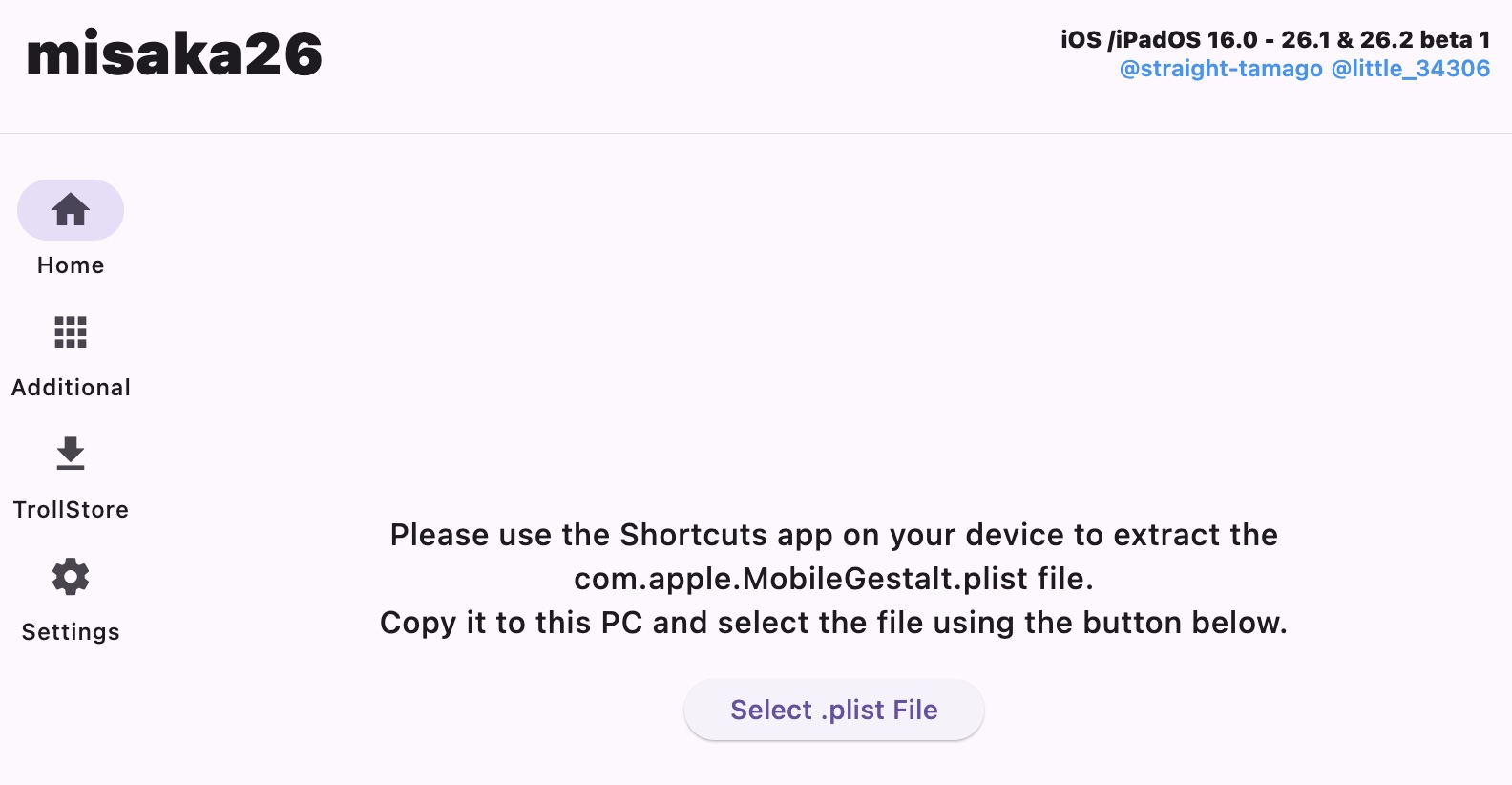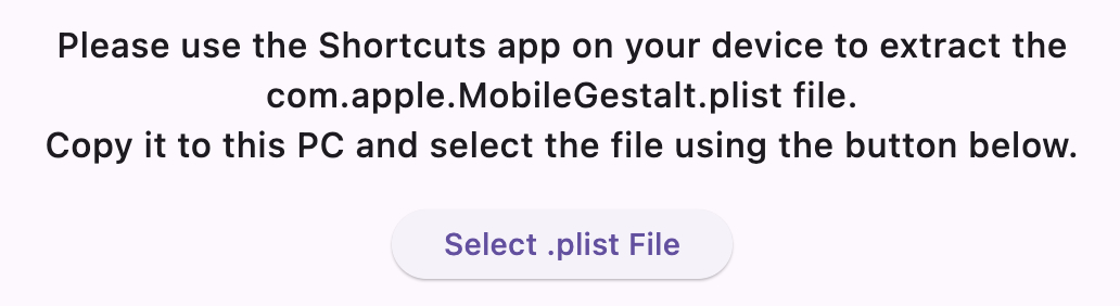 Predtým než budeš pokračovať ďalej, tak je nutné vypnúť v Apple zariadení službu "Find My / Nájsť zariadenie". Keď ju máš vypnutú, tak pripoj mobil cez USB kábel k PC a do programu Misaka26 vlož súbor .plist. Je to možnosť hneď na hlavnej stránke programu.