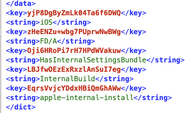 <key>Oji6HRoPi7rH7HPdWVakuw</key> <string>HasInternalSettingsBundle</string> <key>LBJfwOEzExRxzlAnSuI7eg</key> <string>InternalBuild</string> <key>EqrsVvjcYDdxHBiQmGhAWw</key> <string>apple-internal-install</string>